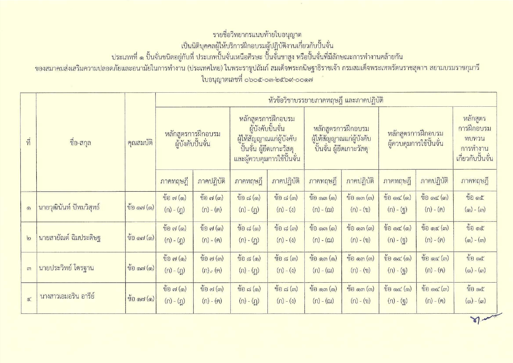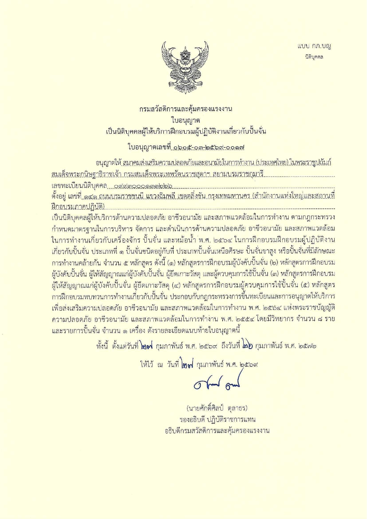 เนื้อหาอบรมตามประกาศกรมสวัสดิการและคุ้มครองแรงงานเรื่อง หลักเกณฑ์และวิธีการอบรมหลักสูตรการปฏิบัติหน้าที่ผู้บังคับปั้นจั่น ผู้ให้สัญญาณแก่ผู้บังคับปั้นจั่น ผู้ยึดเกาะวัสดุ หรือผู้ควบคุมการใช้ปั้นจั่นและการอบรมทบทวนการทำงานเกี่ยวกับปั้นจั่น พ.ศ.2554