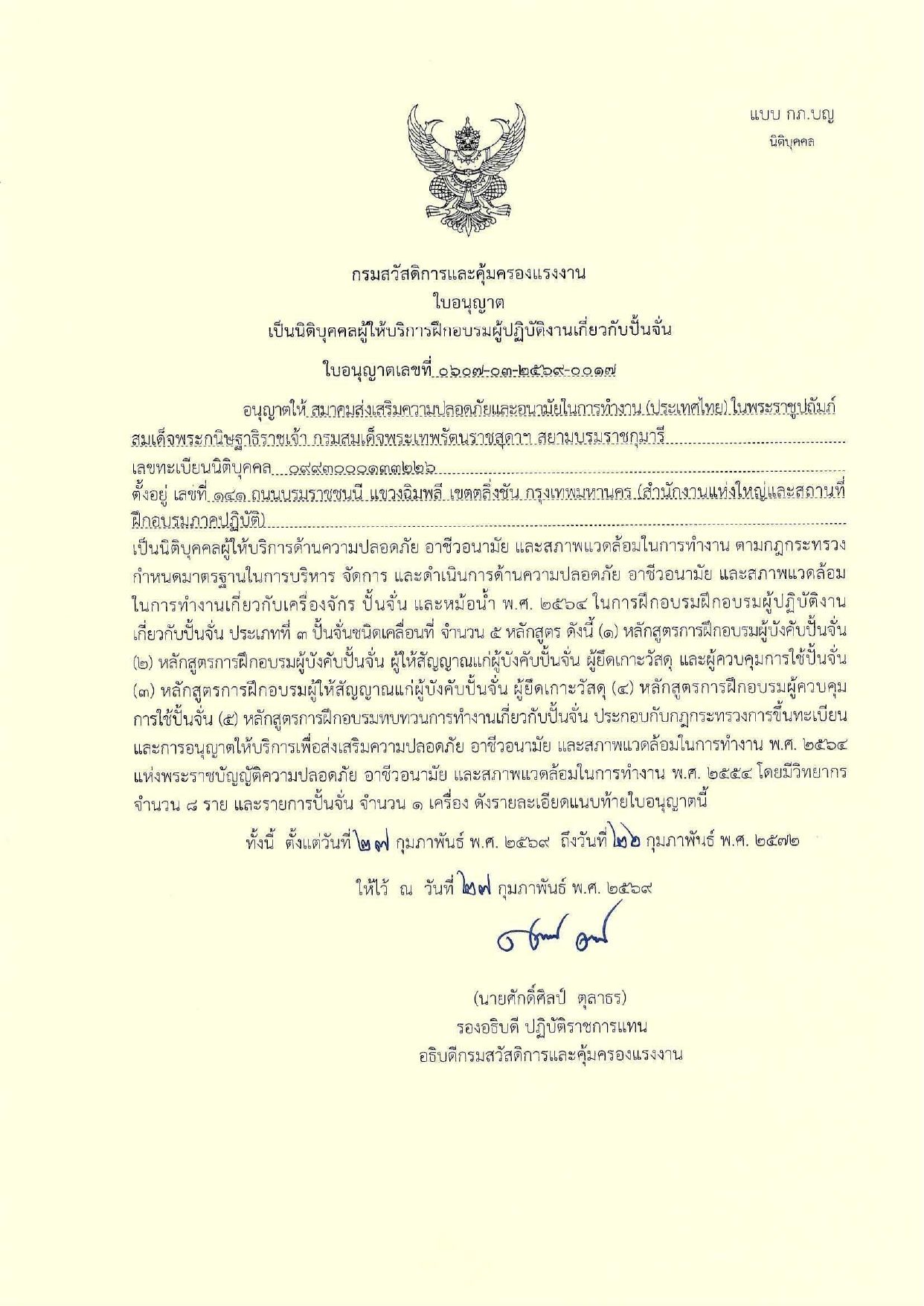 ทั้งนี้เพื่อเป็นการสนับสนุนให้สถานประกอบกิจการที่กฎหมายบังคับใช้ได้ปฏิบัติได้อย่างถูกต้องตามที่กำหนดไว้จึงจำเป็นอย่างยิ่งที่ลูกจ้างซึ่งทำงานเกี่ยวกับปั้นจั่นจะต้องมีการผ่านหลักสูตรการฝึกอบรม ผู้บังคับปั้นจั่น ผู้ให้สัญญาณแก่ผู้บังคับปั้นจั่น ผู้ยึดเกาะวัสดุและผู้ควบคุมการใช้ปั้นจั่น สำหรับปั้นจั่นชนิดเคลื่อนที่ ตามประกาศกรมสวัสดิการและคุ้มครองแรงงาน เรื่อง หลักสูตรการฝึกอบรมผู้บังคับปั้นจั่น ผู้ให้สัญญาณแก่ผู้บังคับปั้นจั่น ผู้ยึดเกาะวัสดุ หรือผู้ควบคุมการใช้ปั้นจั่น และการฝึกอบรมทบทวนการทำงานเกี่ยวกับปั้นจั่น ประกาศในราชกิจจานุเบกษา วันที่ 15 ตุลาคม 2567